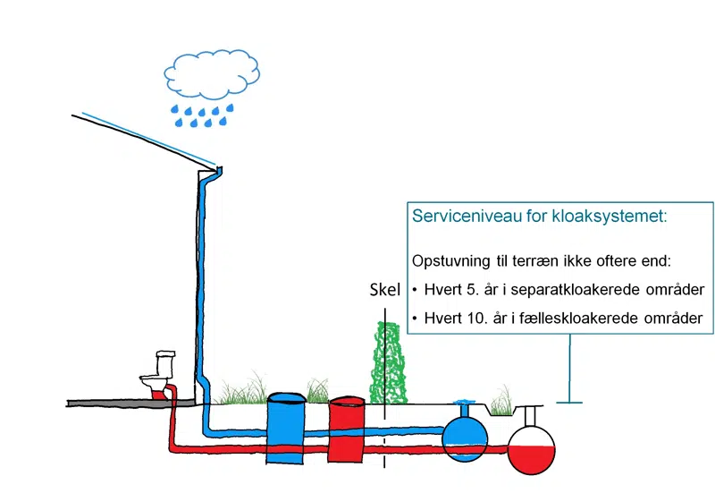Forsyningens spildevandstekniske anlæg dimensioneres derfor i dag efter Spildevandskomitéens Skrift 27, der siger, at der maksimalt må ske opstuvning til terræn 1 gang hvert 5. år i regnvandssystemer og hvert 10. år i fællessystemer.